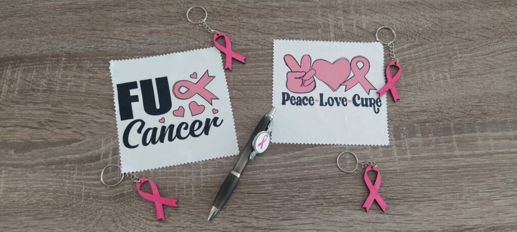Je peux vous proposer, comme les années précédentes, des totbags, des badges, des stylos, des essuies lunettes, des portes clés, des bracelets(réalisés par mon fils qui souhaite participer à cette action aussi) et tout ce que vous pouvez voir sur ma page Facebook (tant qu’il y a le logo octobre rose dessus).